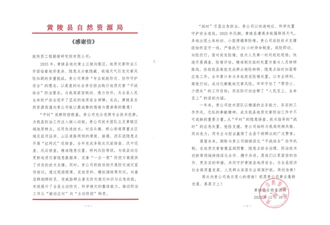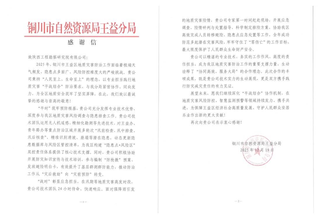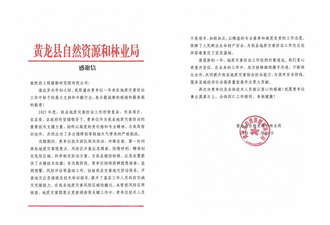 近日,公司接連收到黃陵縣、王益區(qū)、黃龍縣自然資源部門(mén)發(fā)來(lái)的感謝信,對(duì)公司在2025年度地質(zhì)災(zāi)害技術(shù)支撐工作中表現(xiàn)出的專業(yè)能力、高效響應(yīng)與奉獻(xiàn)精神給予高度評(píng)價(jià)和誠(chéng)摯感謝。